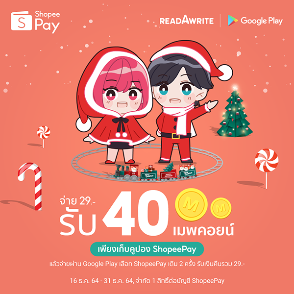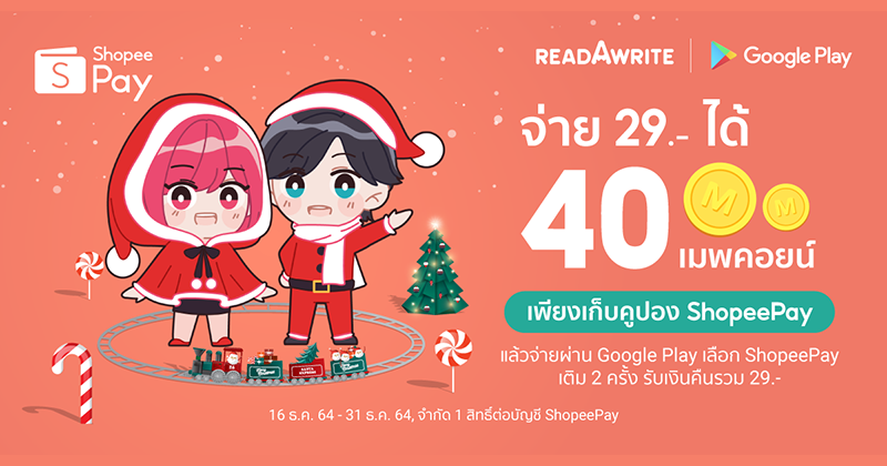 เข้าแอป readAwrite แล้วซื้อเมพคอยน์ราคา 29.- เลือกจ่ายผ่าน ShopeePay บน Google Play โดยทำรายการ 2 ครั้ง